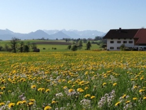 7,5 km lange sehr sonnige Rundwanderung mit grandiosem Alpenpanorama in kleinbäuerlicher Landschaft nördlich von Bad Aibling.